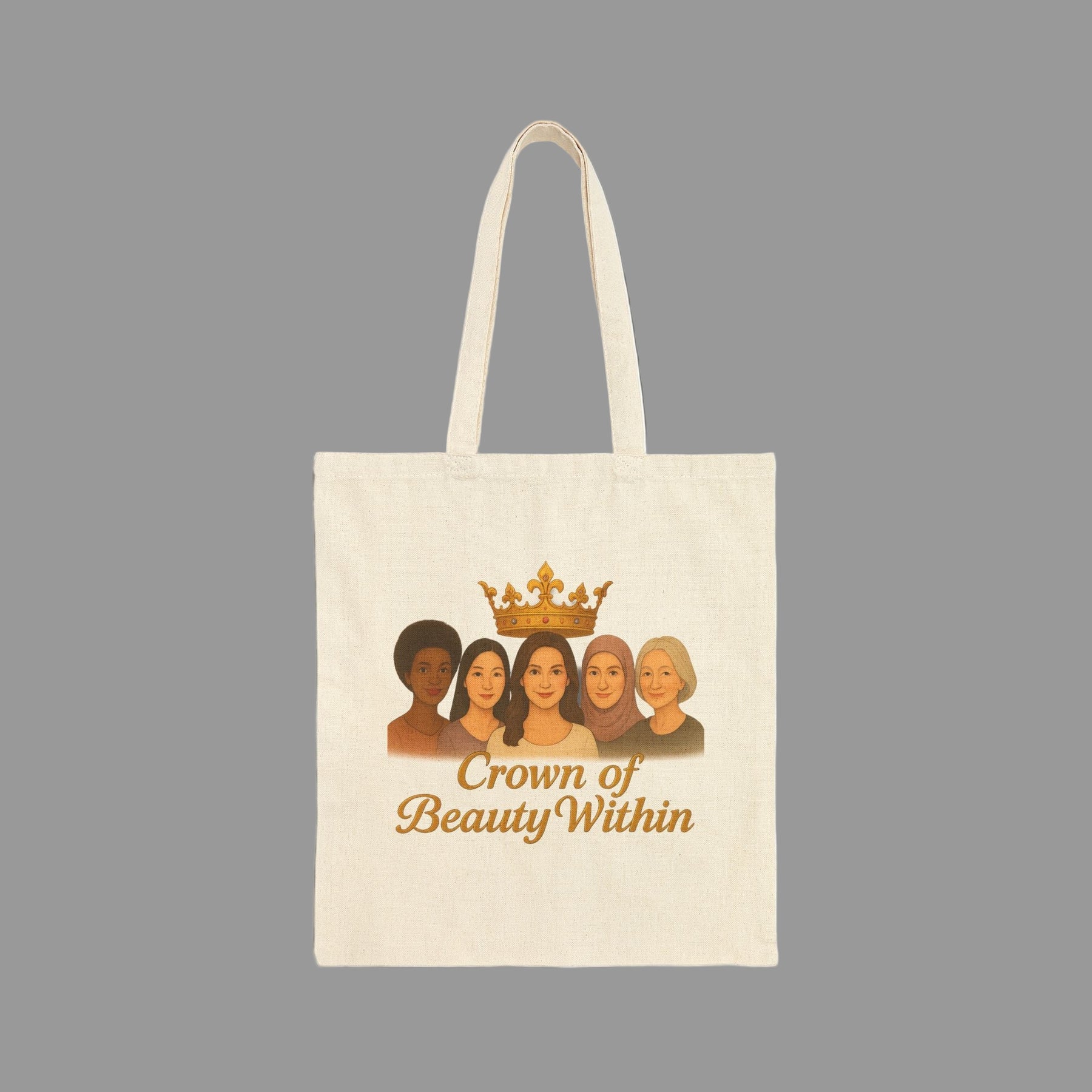 • Design: Full-color print on natural canvas, featuring diverse women and a gold jeweled crown