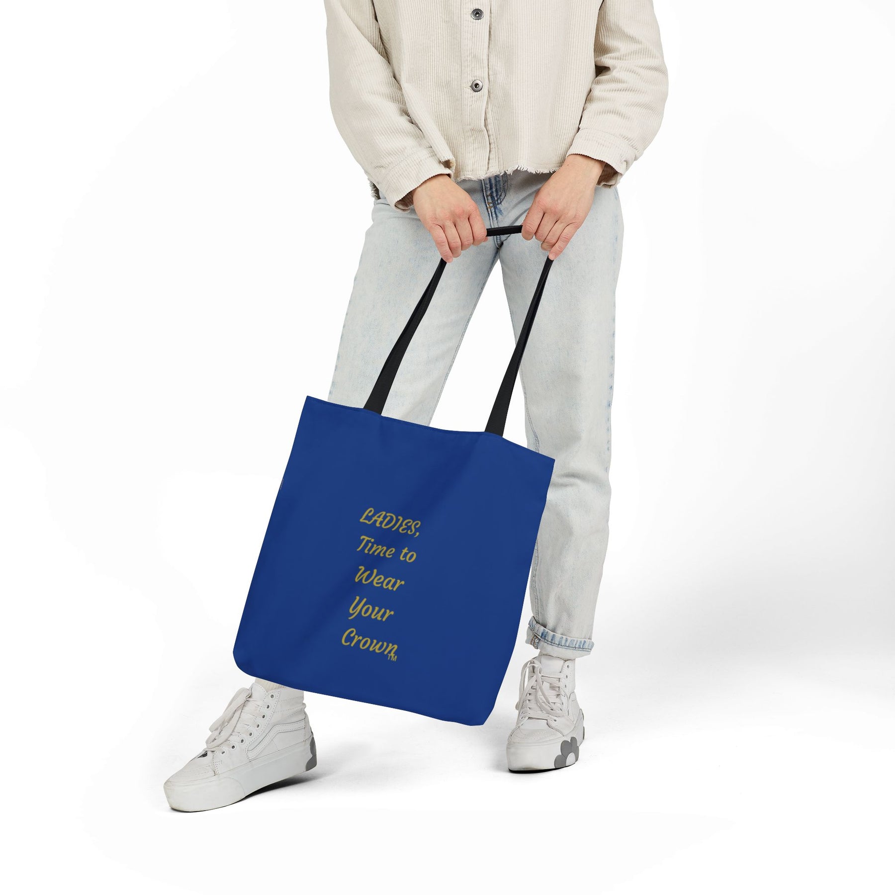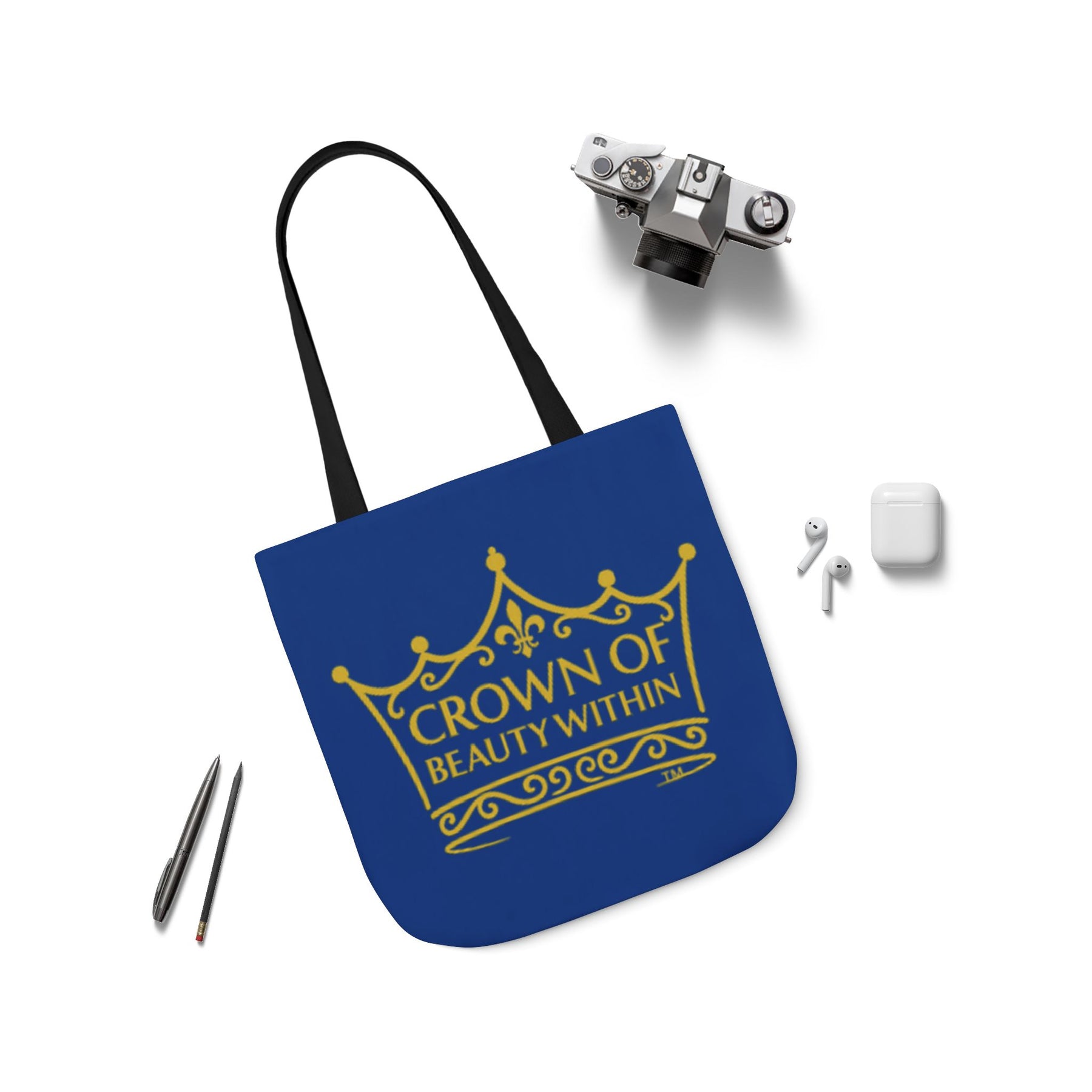 Add a bold statement to your daily errands, outings, or gifting moments with our Signature Crown Dark Blue Tote Bag—featuring the iconic "Crown of Beauty Within™" design on the front and the empowering phrase “Ladies, Time to Wear Your Crown™” on the back.